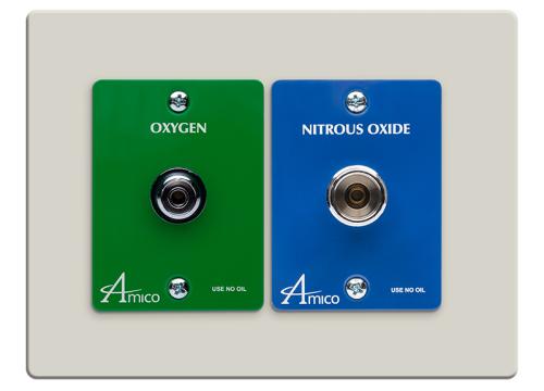The Amico Dental Outlet Assembly is a perfect solution for a Dentist’s Nitrous systems located in tight spaces and cabinets. The smaller fascia allows the Nitrous Oxide and Oxygen connections to be located in places where space is limited. Since each gas is a separate outlet it is simple to replace/repair a single outlet without having to remove the entire assembly.